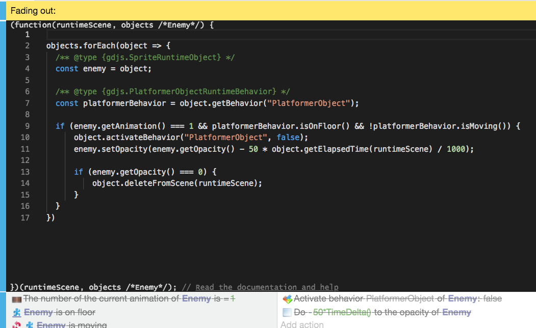 . This variable represents the scene being played. Below is an example of a standard GDevelop event, and an equivalent event that uses a JavaScript: