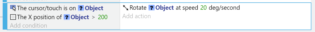 - A condition that uses an object as parameter will only pick for the conditions and actions following it objects that meet said condition.