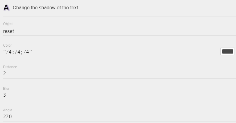 • You can set a Shadow using the action "text shadow/show shadow". When changing the shadow, you can choose the color, distance, blur, and angle. This can also be used to create a glow effect with bright colors.