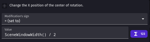 To center your text in the scene window, use the Center X position action with a value of SceneWindowWidth() / 2