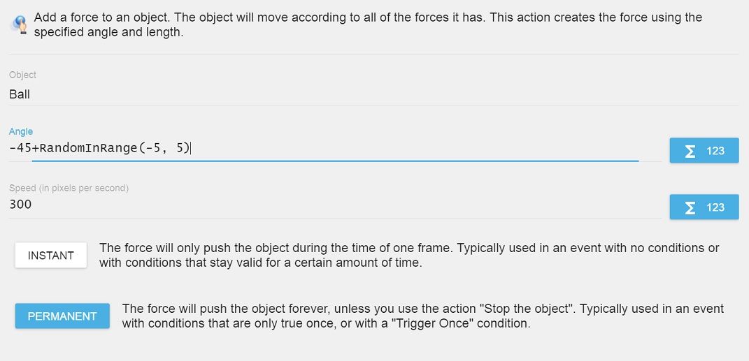 - Click Common actions for all objects > Movement > Add a force (angle).