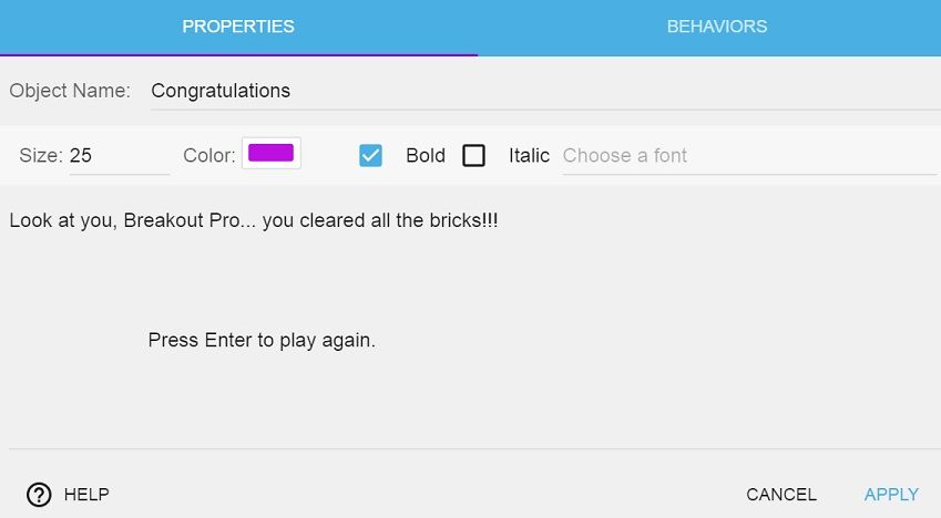 - In the Text field, type a congratulatory message (e.g. Congratulations! You cleared all the blocks!). Also include a line telling the player "Press Enter to play again."
