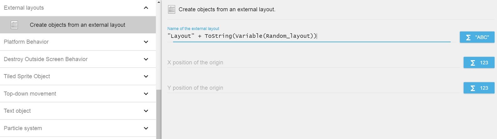 - In the Name of the external layout field, type "Layout" + ToString(Variable(Random_layout)). This will randomly add one of the external layouts to the scene.