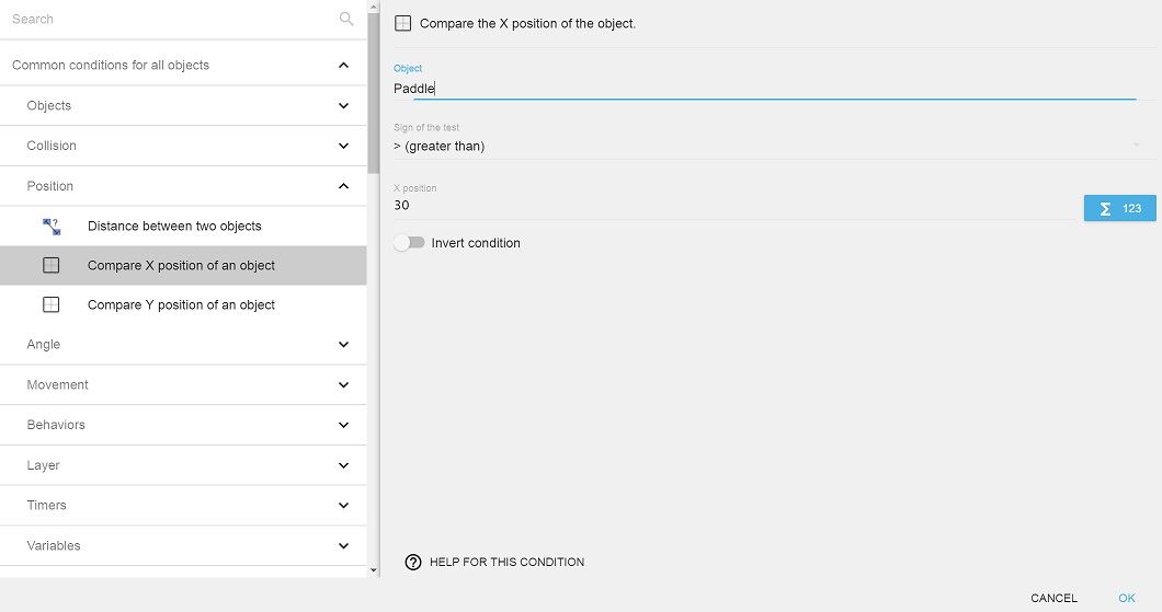 Click Common conditions for all objects > Position > Compare X position of an object.