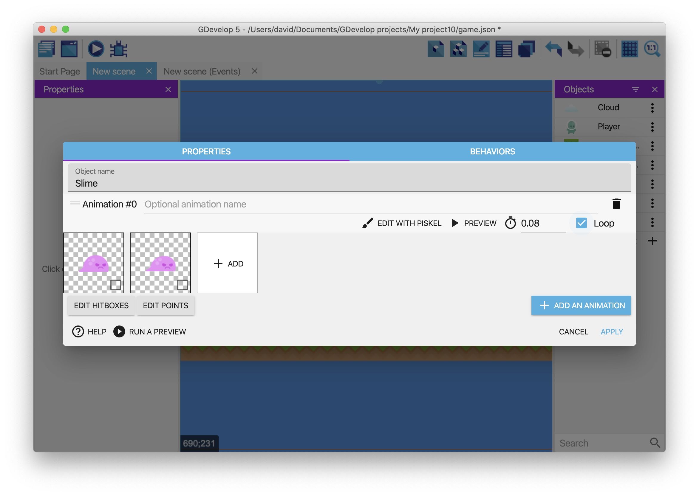 This part of the tutorial explains how to add enemies to the game that can move back and forth along a set route. The next part of the tutorial explains how the player can kill -- and be killed by -- these enemies.