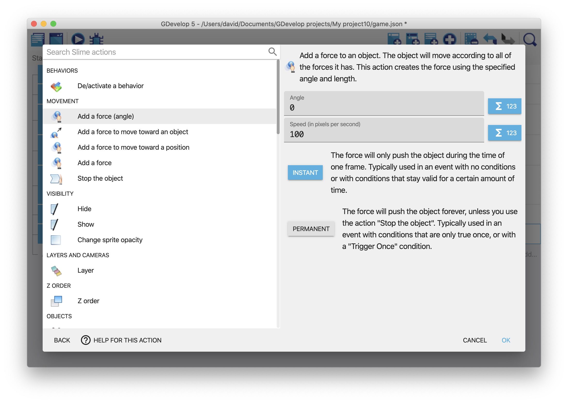 - Add a Collision condition that checks if the "Slime" object is colliding with the "Left" object.