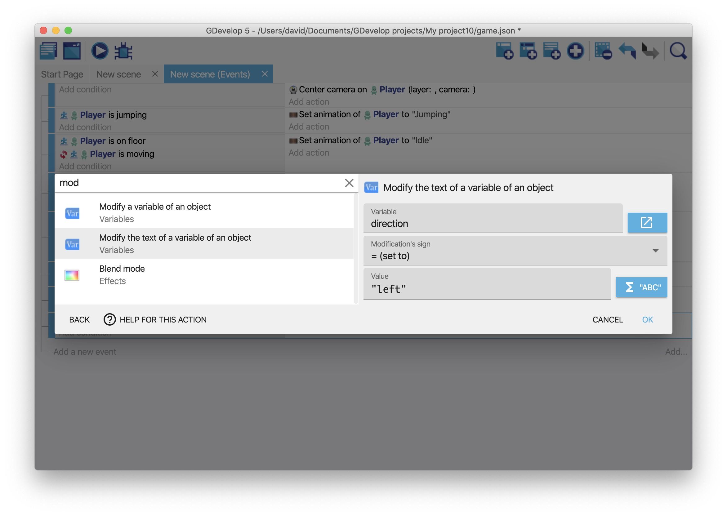 - Add a variable named "direction" with a value of "right". This is the default value of the variable.