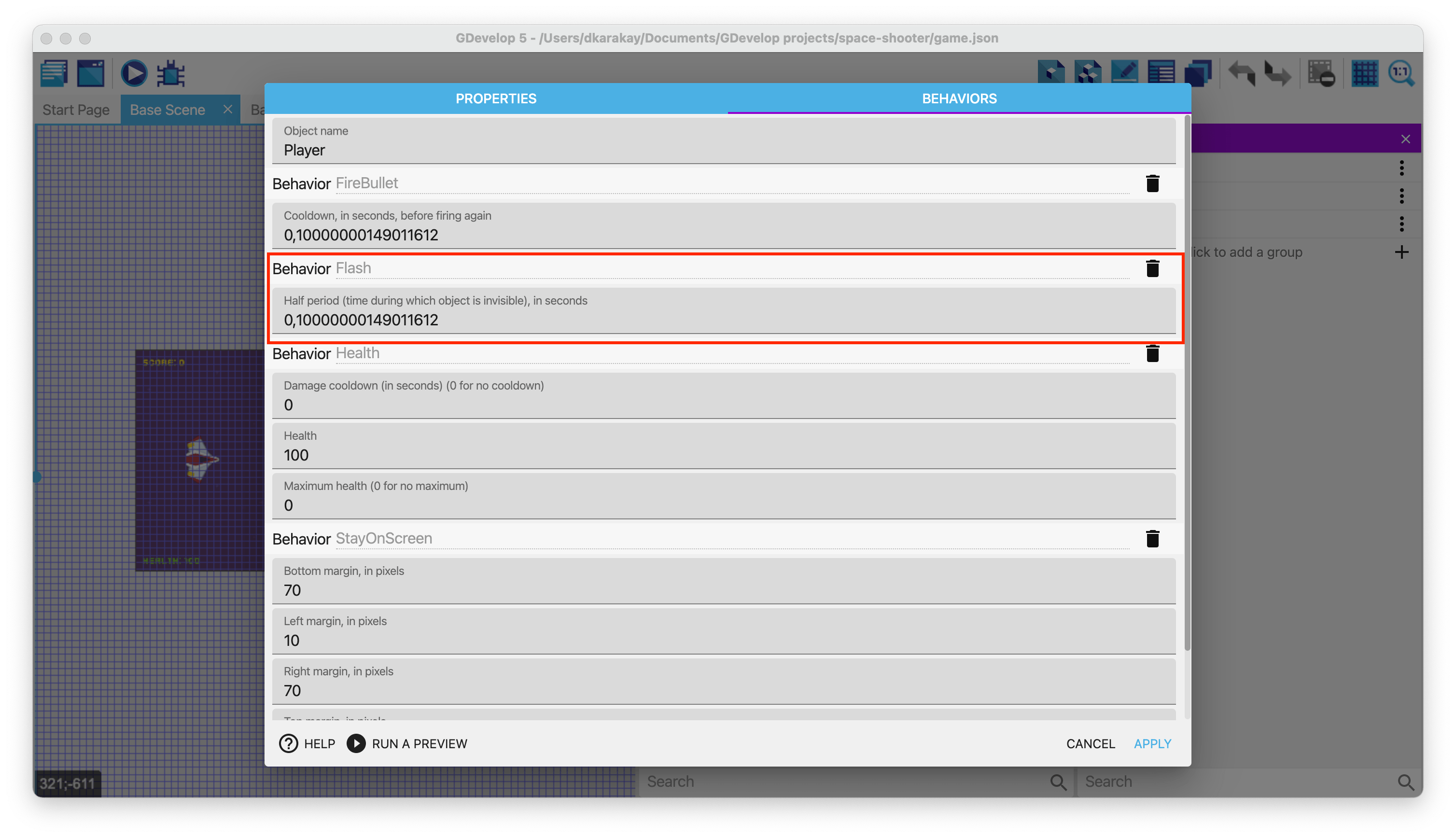 We will use a blinking effect for the player when the player gets damaged. In GDevelop, there is a behavior for blinking, so go to the player's behavior settings. Then search "blink" to install the action called Flash.