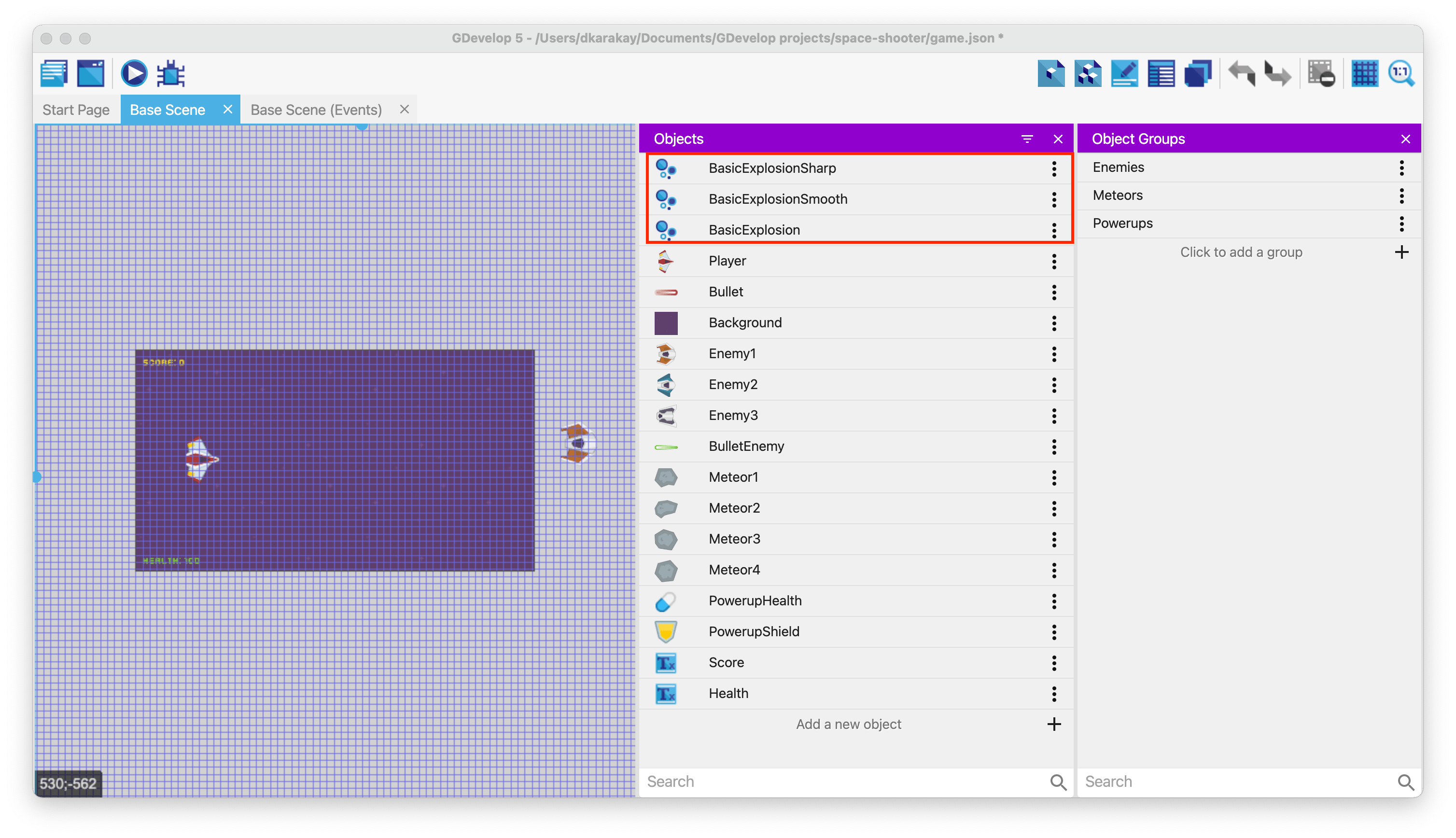 Add a new action to create these explosion objects. Select BasicExplosionSharp and choose create an object. Fill X position with Enemies.X() and Y position with Enemies.Y().