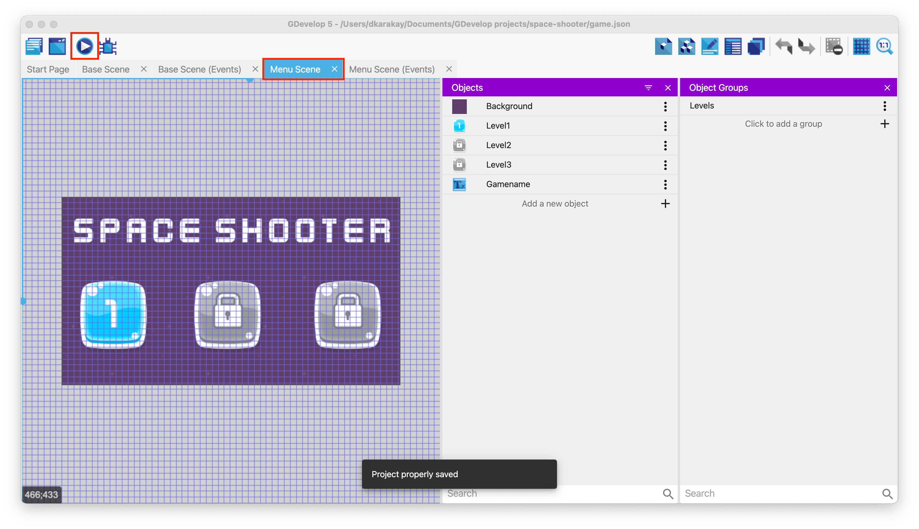 Create a new global variable called "LevelSelection" and set its initial value to 1. Then, change this variable to open the specific level (e.g., change it to 2 to load Level 2). Then add an action to run Base Scene. In the end, your events should look like this: