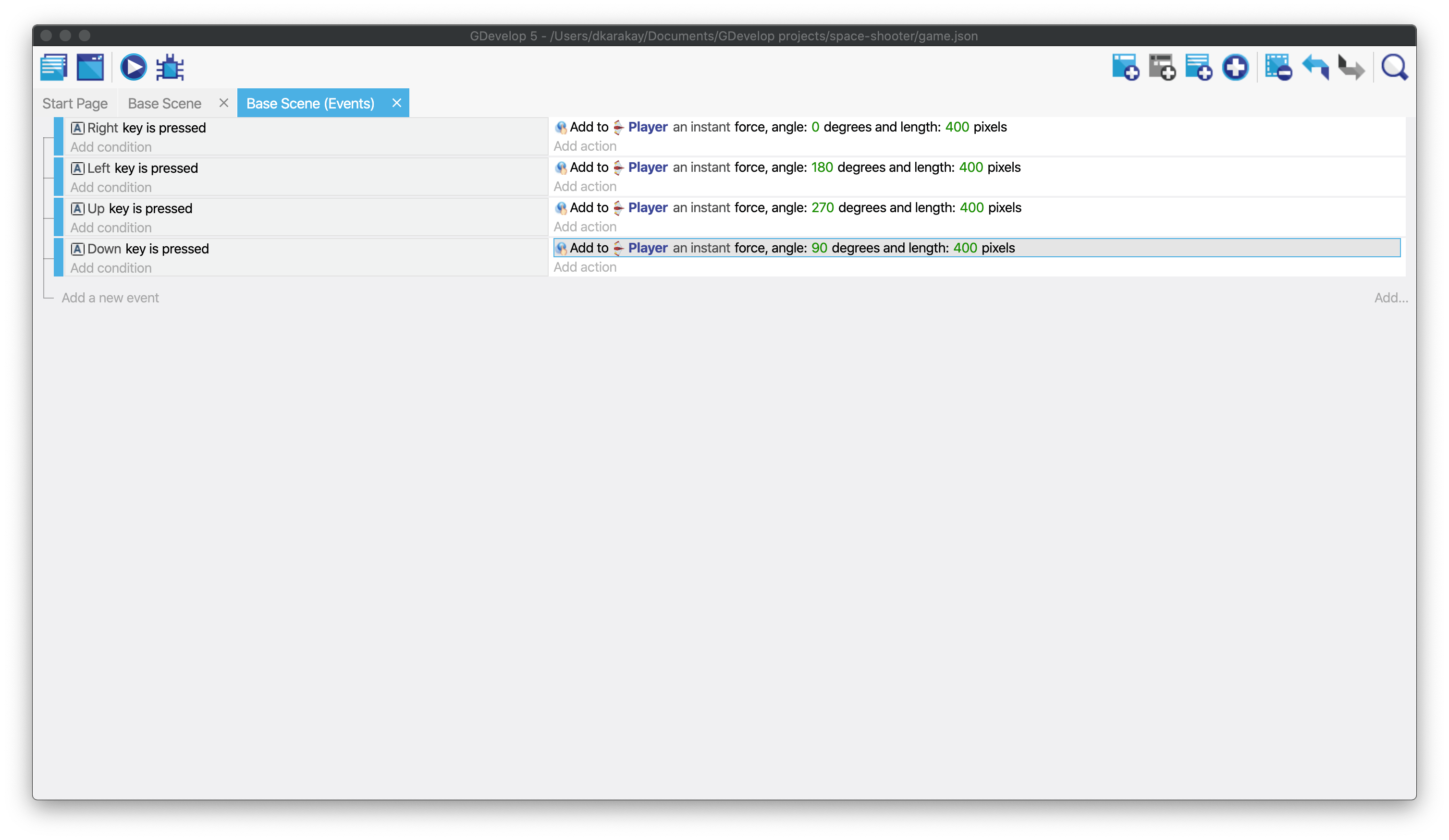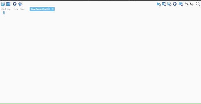 Click on the "Base Scene (Events)" tab to open the events editor, where we define the rules of the game using conditions and actions. Click on the event icon to add an empty event.