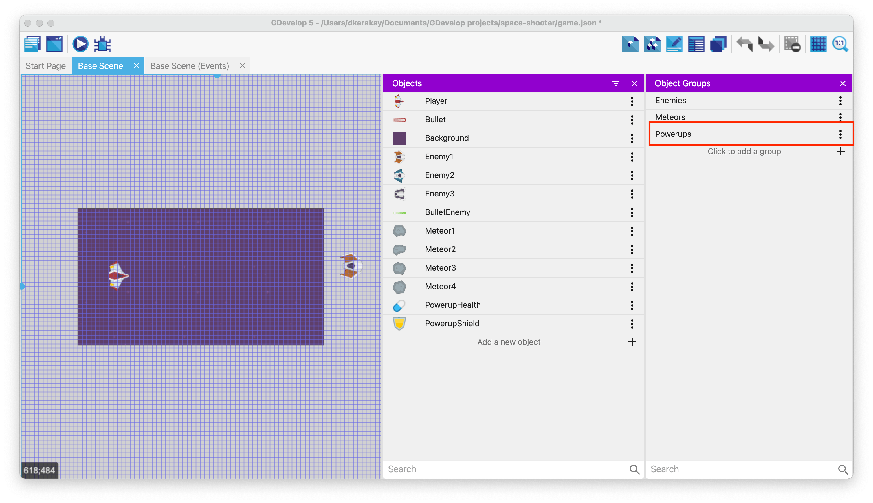 Before testing powerups, we should change the scale of powerup objects just like in the previous cases. Select Powerups object group and set scale factor to 1.5: