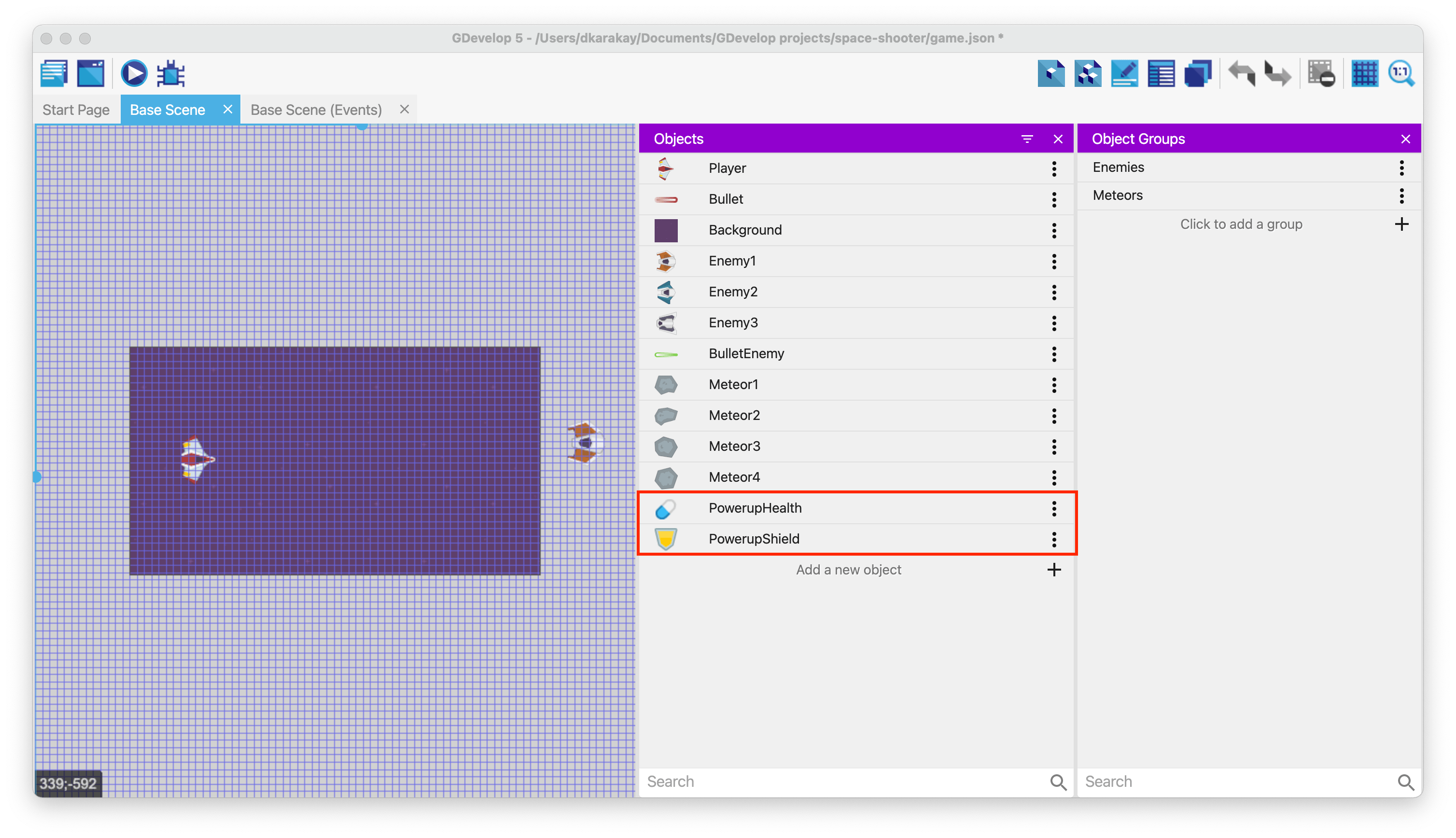 We will add two objects called "PowerupHealth" and "PowerupShield." Select the "powerup_health.png" image from the assets folder for the health object. Repeat the same process for shield object by choosing the "powerup_shield.png" image. In the end, you should see: