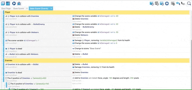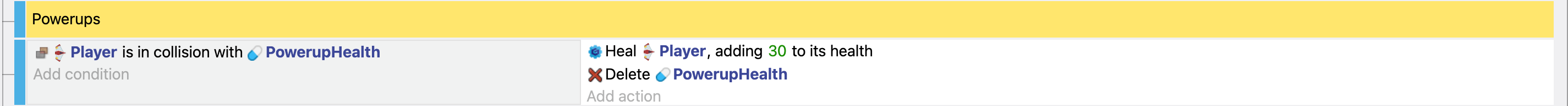 We are ready to open the "Events" page. We will add a new condition to check the collision between the Player and the PowerupHealth objects. If the collision happens, we want to increase the player's health by 30 and delete the powerup object since we do not need it anymore.
