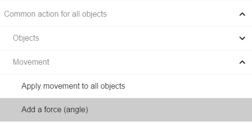 This time, choose the action called "Common action for all objects" "Movement", "Add a force ( Angle )".