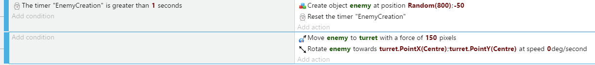 Let's go back to the game. We want the enemies to move toward the turret. Go to the "Event" editor and Add a new event. We want to create an enemy every second. Add a condition, that can be found in category "Timers and time", called "Value of a scene timer". Enter 1 as the "Time in seconds" and "EnemyCreation" for the "Timer's name". //Don't forget the quotes when you enter the name of the timer.//