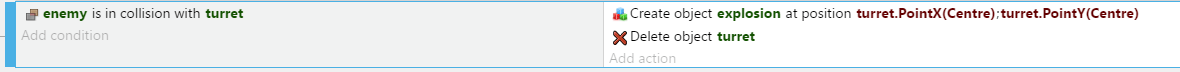 Finally, add the action after creating the explosion Common actions for all objects > Object > Delete an object and on the right side for parameter select the object enemy as we want to delete the enemy.