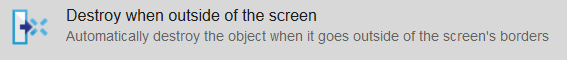 We could add an event to destroy the bullets when they are too far from the turret, that is easy, but we can also use an object "Behavior". A behavior in GDevelop adds a certain feature to an object. In this case, we are going to add the "Destroy outside screen" behavior to the bullets. They will then get destroyed when they are outside of the game screen.