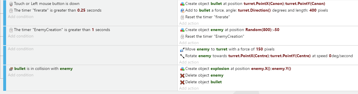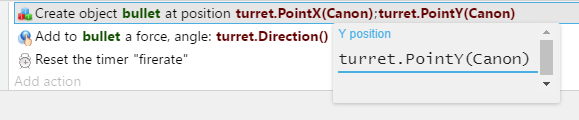 The only thing is left to do is to tell GDevelop to fire the bullets from the "Canon" point of the "turret" object. So in our "create bullet" action, we need to change turret.X() and turret.Y() expressions, to turret.PointX("Canon")