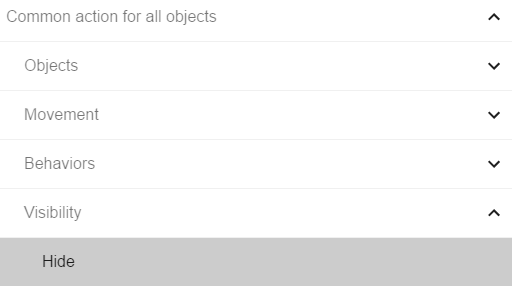Next, add the action to the "At the beginning of the scene" event. Use: "Common Actions for all objects", "Visibility", "Hide".