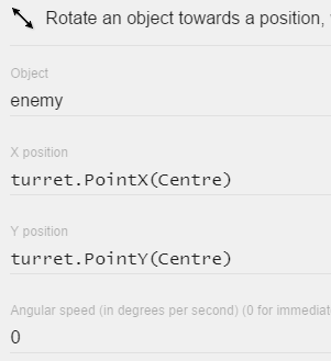 Add a second action after the movement: "Common action for all objects", "Angle", "Rotate toward position". For the first parameter on the right of the panel, select "enemy". We want to rotate the enemy. For the X and Y position, we are going to use an expression to get the Centre point of the turret and make the enemies rotate toward that point with an angular speed of 0. An angular speed of 0 causes immediate object rotation.
