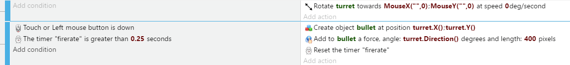 The next event needed will check to see if the left mouse button is clicked/pressed. If it is pressed/clicked, the action will create the bullets that will be fired.