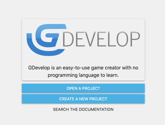 Once you have installed GDevelop, launch it. The Interface's "Start" page will be displayed: